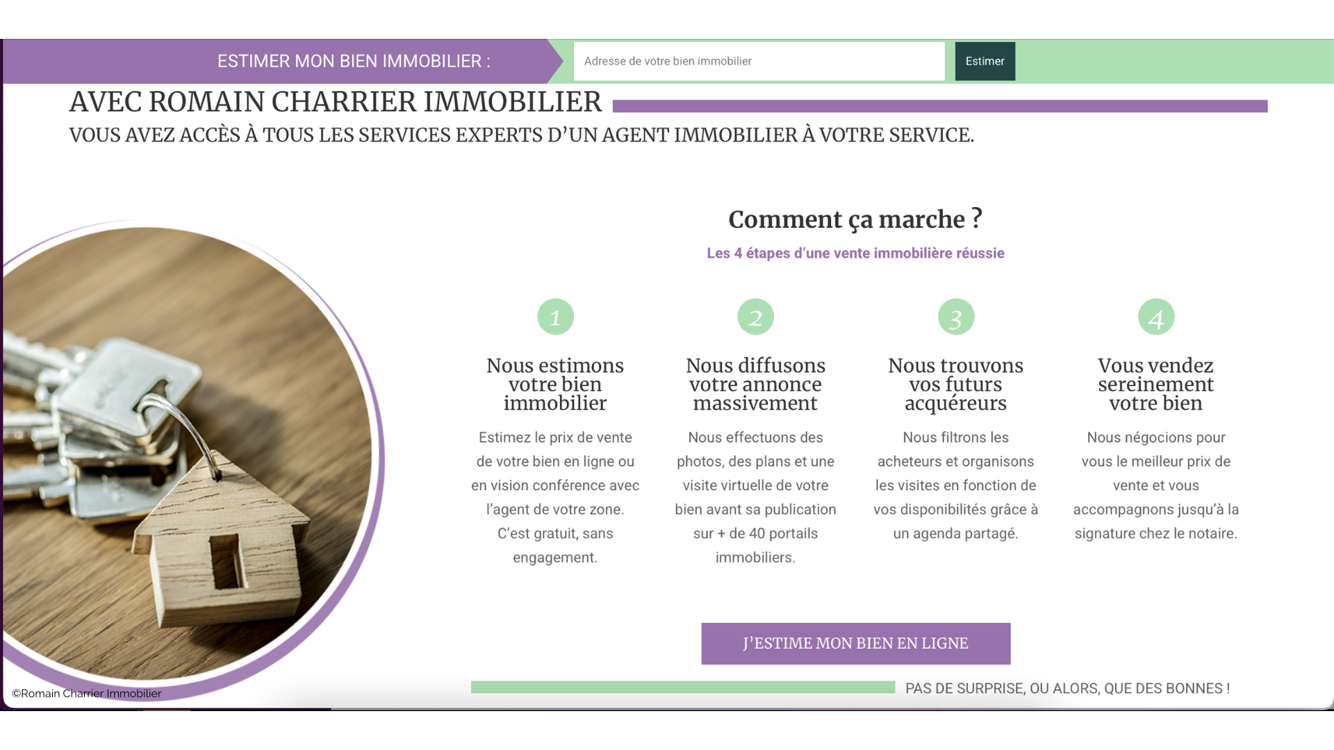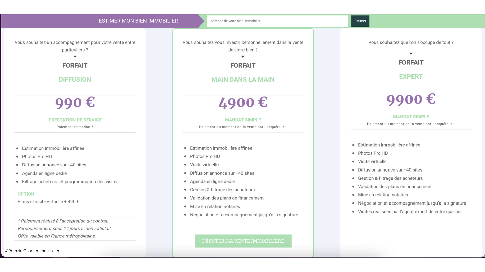 Une agence immobilière en ligne qui conjugue les avantages de transactions entre particuliers à l’expertise d’une agence immobilière classique, tout ça sur une interface en ligne qui permet à tout un chacun de vendre ou acheter un bien. Des formules à prix plancher, des services pro, un paiement au résultat, pas de commission d’agence, Romain Charrier Immobilier ne manque pas d’arguments !