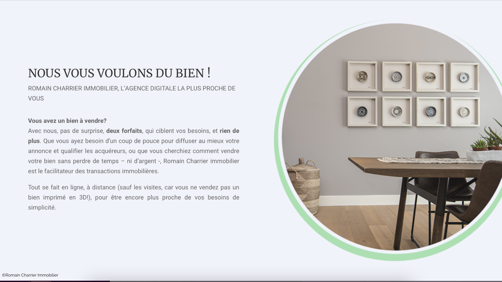 Dans un premier temps, nous avons établi avec lui une réflexion stratégique afin de définir une architecture de site web claire, simple pour optimiser l’expérience utilisateur, nous avons créé tous les contenus du site web Romain Charrier Immobilier, en dégageant une promesse et en soulignant les caractéristiques de l’offre. Détail des services, clarification des forfaits, mise en avant de l’expertise professionnelle et des cautions de réassurance, il s’agissait de montrer tout l’intérêt pour l’acheteur et le vendeur de faire appel à une agence immobilière digitalisée versus les sites de transactions entre particuliers. Le service était donc au cœur du propos. Puis, nous lui avons proposé un elevator pitch, un texte éclair pour résumer son concept et ses bénéfices en 30 secondes chrono.